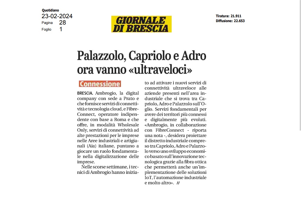 Ambrogio e Fibreconnect portano la fibra ottica nell'area industriale...24 Gennaio 2024